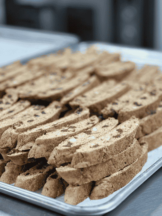 Ingredients | cinnamon, Flour (Bleached wheat flour enriched [Bleached wheat flour, niacin, reduced iron, thiamine mononitrate, riboflavin, folic acid], malted barley flour), sugar, eggs, almonds, butter, semisweet chocolate chips (Cane sugar, unsweetened chocolate, cocoa butter, whole milk powder, soy lecithin, vanilla extract), baking powder, salt |